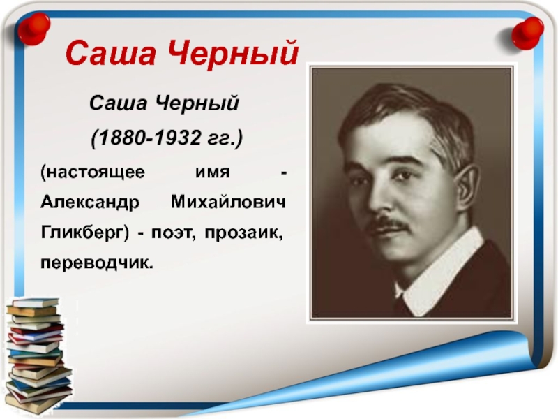 Саша Чёрный (Александр Михайлович Гликберг) —талантливый русский поэт Серебряного века. Родился 13 октября 1880 года в Одессе. Семья имела еврейские корни — отец работал в крупной фармацевтической компании, а мама была домохозяйкой. Чтобы мальчик мог поступить в гимназию вне процентной нормы, его крестили в православной церкви, но стремление к учёбе Саша не проявлял и его […]