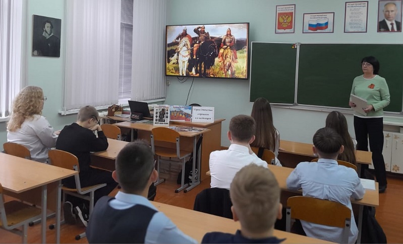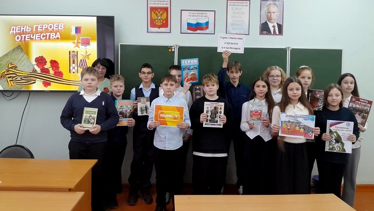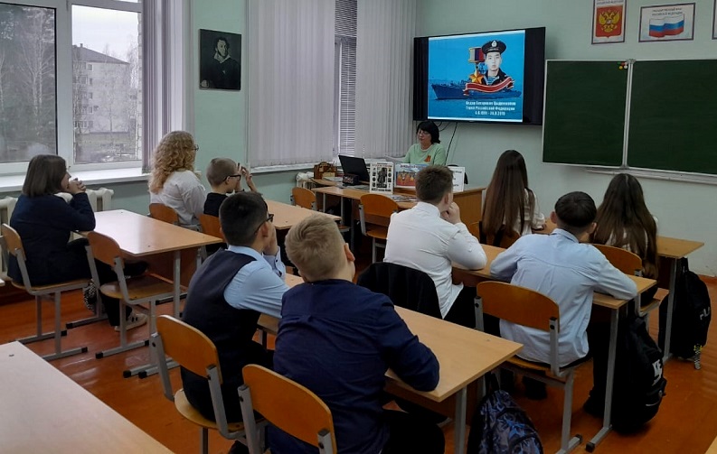 Просмотрев видеопрезентацию школьники познакомились с историей праздника, а также вспомнили имена великих полководцев, которые выковали славу и величие нашей страны: Александр Невский, Дмитрий Донской, Александр Суворов, Фёдор Ушаков, Георгий Жуков и другие. Затем поговорили о героях — земляках нашего времени – участниках Афганской, Чеченской войн и специальной военной операции.