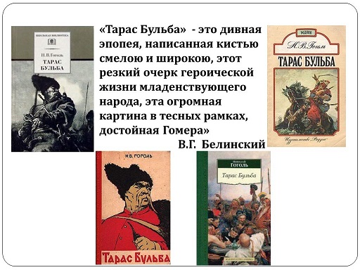 Гоголь работал над повестью девять лет, за всё время изучил большое количество исторических источников и фольклора. Основная мысль, которую автор хотел передать в своей повести – это безграничная любовь к своей Родине, готовность служить ей верой и правдой. Гоголь с поразительной силой воссоздает атмосферу казацкой вольницы, описывая их быт, нравы, обычаи и военные традиции, живописует картины битв и пиров, передает суровый дух запорожцев. Кроме того, в своей повести автор затрагивает такие важные проблемы, как взаимоотношение отцов и детей, сложность нравственного выбора, самопожертвование, честь и предательство.
