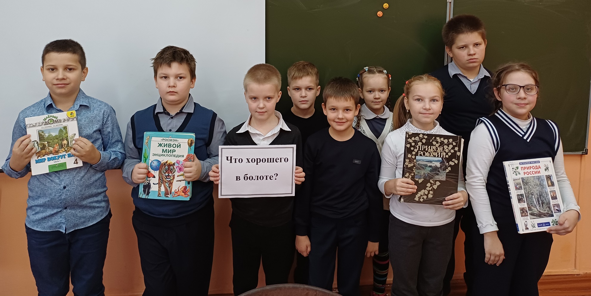 На заседании экологической гостиной аистёнка Климки для ребят 3 «г» класса Климовской школы № 1 библиотекарь детской библиотеки провела экологический час «Что хорошего в болоте».